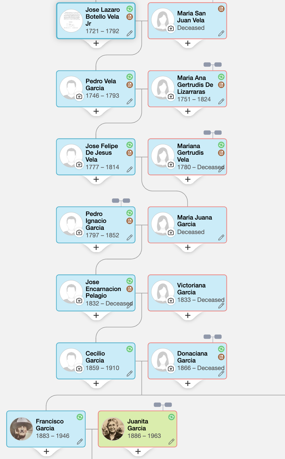 Jose Lazaro Vela Sr. (marries Petronilla Vela Ortiz born Botello Barbosa) #265 on family tree—>Jose Lazaro Botello Vela Jr. (marries Maria San Juana Sepulveda de la Garza) ->Jose Pedro Vela Sepulveda—>Jose Felipe de Jesus Vela—>Maria Juana VELA Benavides—>Jose Encarnacion Garcia—>Cecilio Garcia—>Francisco Reynaldo Garcia—>Reynaldo Garcia—Becky Garcia Guittar (me).