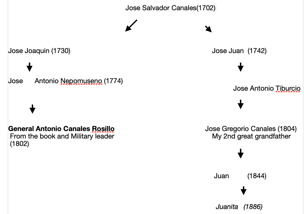 With the last name of Canales, I knew there needed to be a connection. My grandmother’s name is Juanita Canales. I dug into the connection with the sources which included, “The Descendants of Don Juan Canales” by John D. Inclan (www.somosprimos.com/inclan/canales) and “Canales” by Moises Garza. General Antonio Canales Rosillo (born 1802) and my great great grandfather, Jose Gregorio Canales (born in 1804) share the same great grandfather Jose Salvador Canales born in 1702. He is my 5th great grandfather, 8 generations back. He has 2 children, they include: